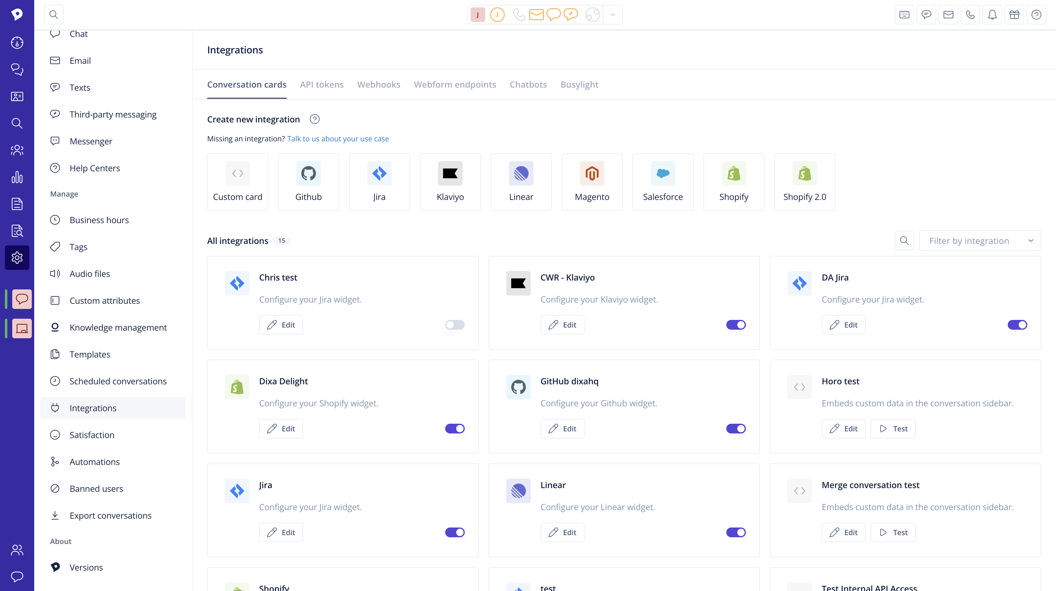 - When logged into Dixa, go to the Settings page. Scroll down to the "Manage" menu and find "Integrations".